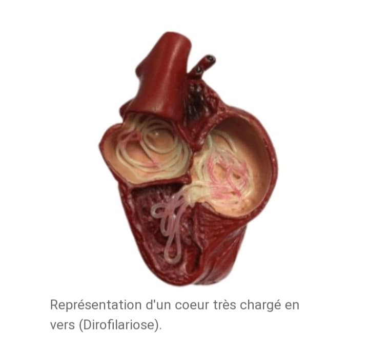 Ces vers parasites se logent dans les artères pulmonaires et débordent souvent dans le coeur par leur nombre et leur longueur. C'est pour cette raison qu'on les appelle, plus communément, "vers du coeur".